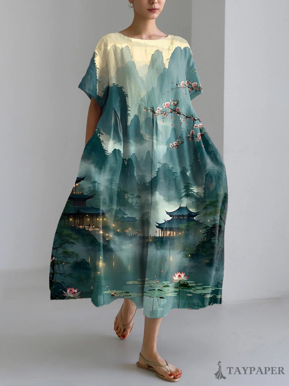 Asian Art Print Linen Blend Maxi Dress