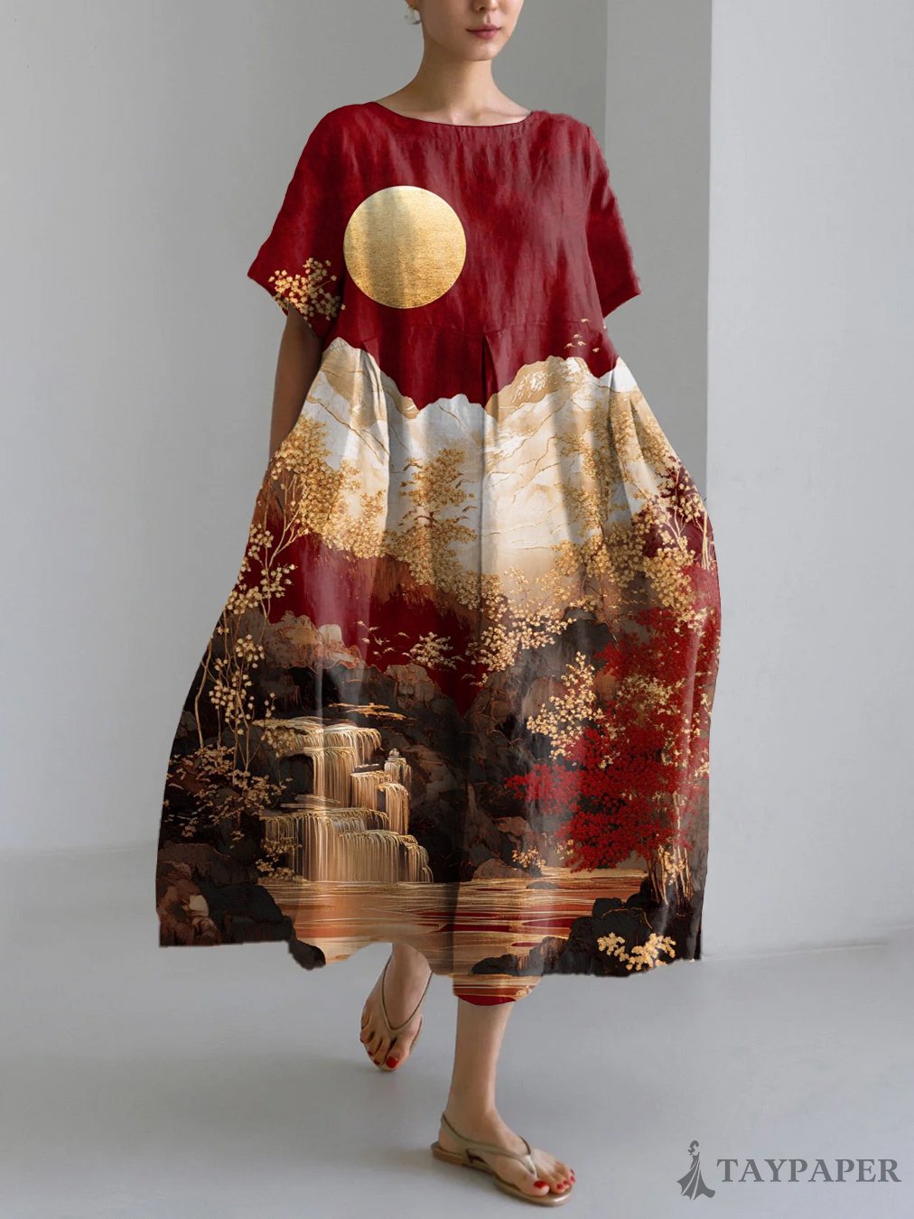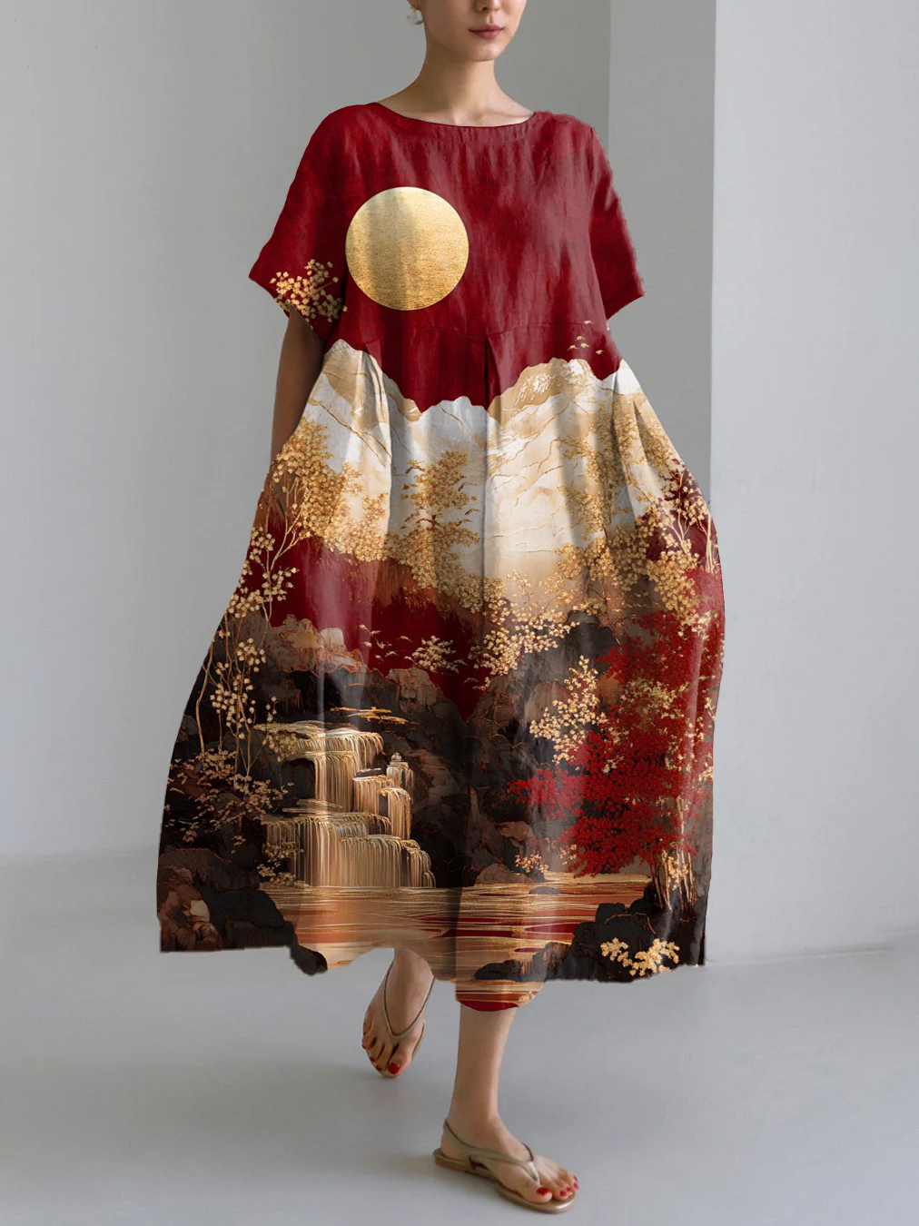 Asian Art Print Linen Blend Maxi Dress