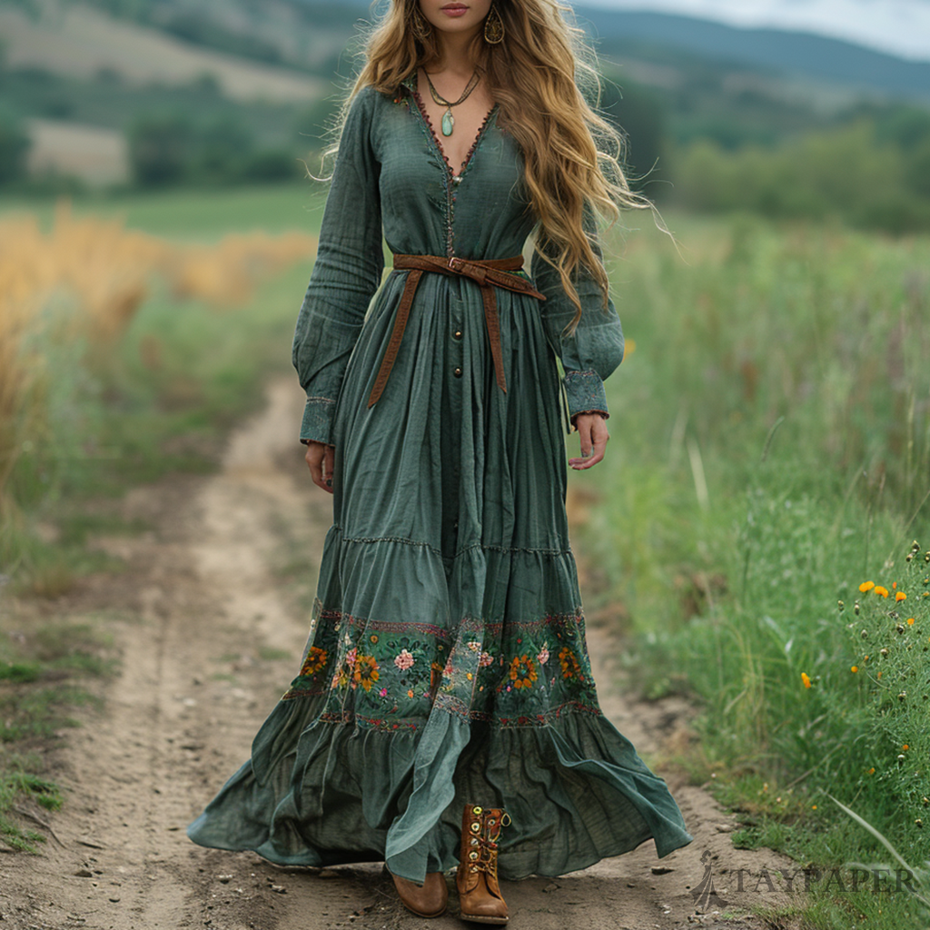 Women's Vintage V-neck Bohemian Pastoral Style Long-sleeved Maxi Long Dress