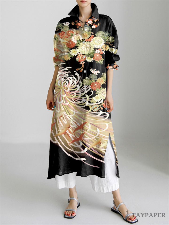 Chrysanthemum Japanese Floral Contrast Long Sleeve Slit Shirt Dress