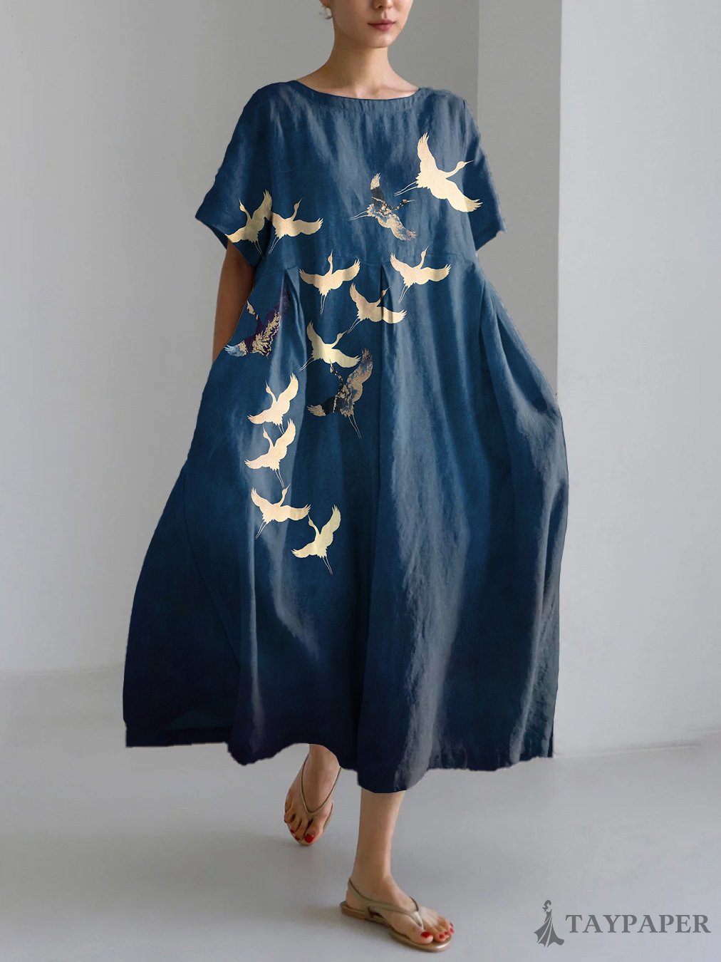 Cranes Japanese Art Print Linen Blend Maxi Dress