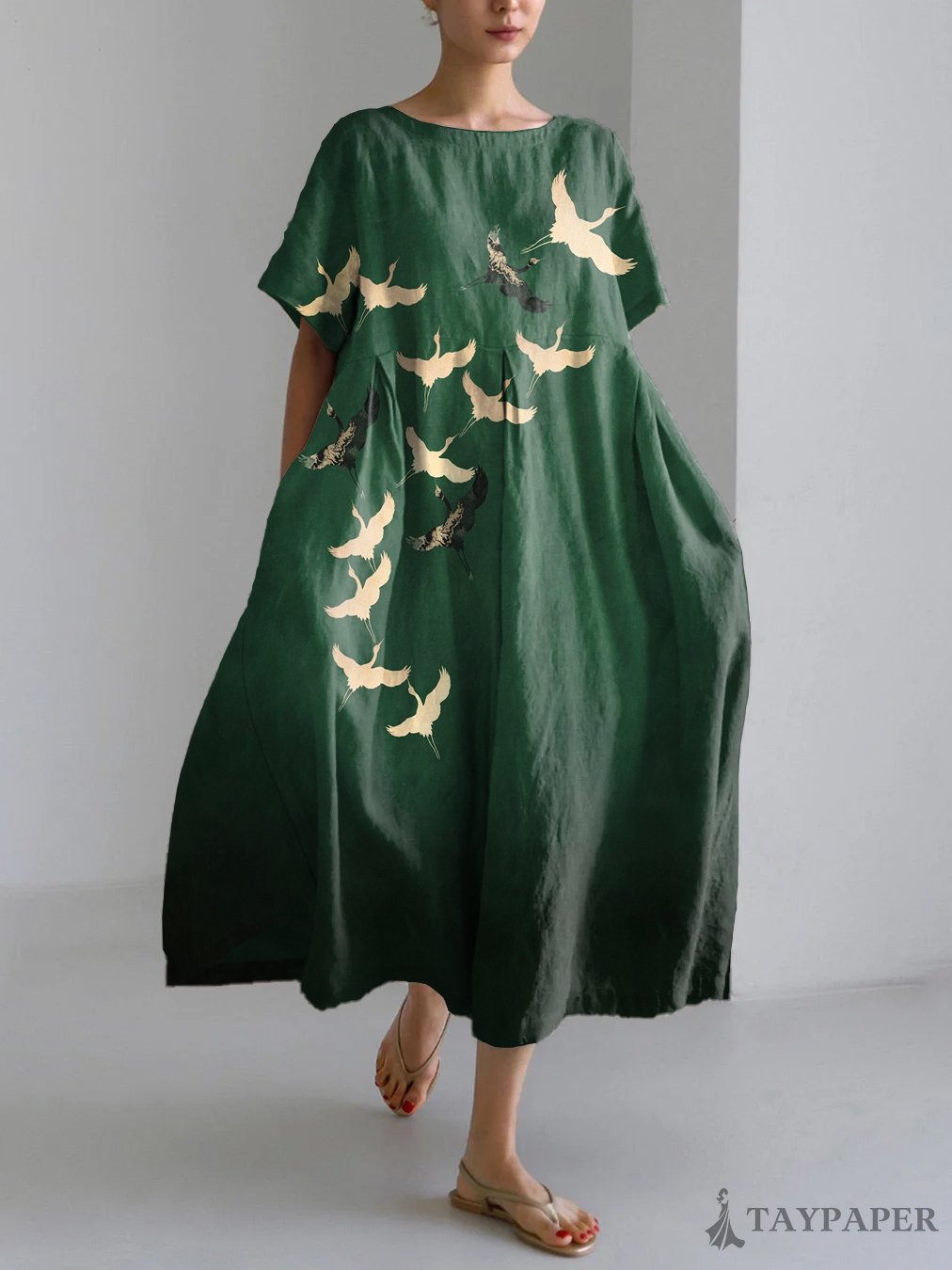 Cranes Japanese Art Print Linen Blend Maxi Dress