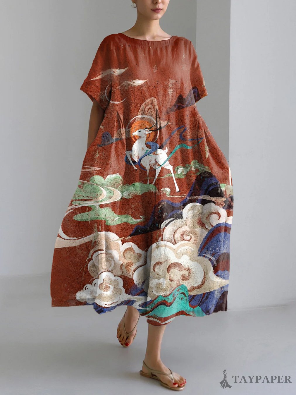 Deer Asian Art Print Linen Blend Maxi Dress