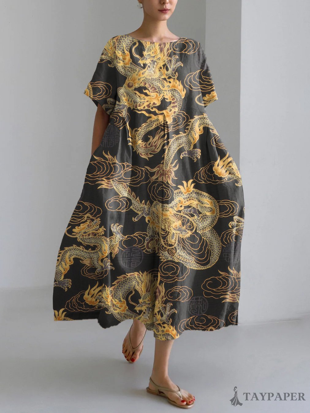 Dragon Asian Art Print Linen Blend Maxi Dress