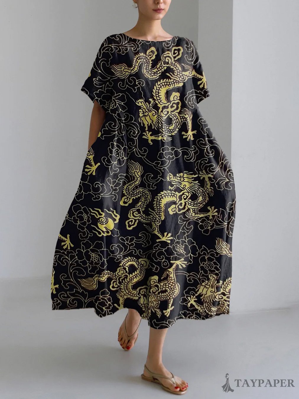 Dragon Asian Art Print Linen Blend Maxi Dress
