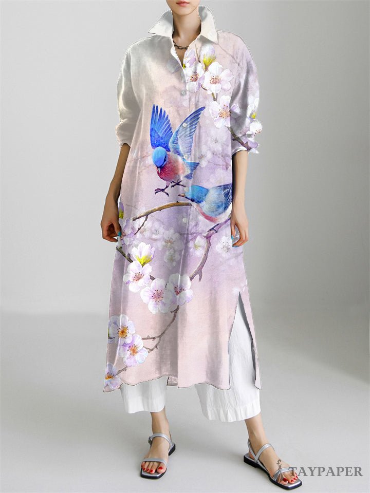Floral Art Print Long Sleeve Slit Shirt Dress
