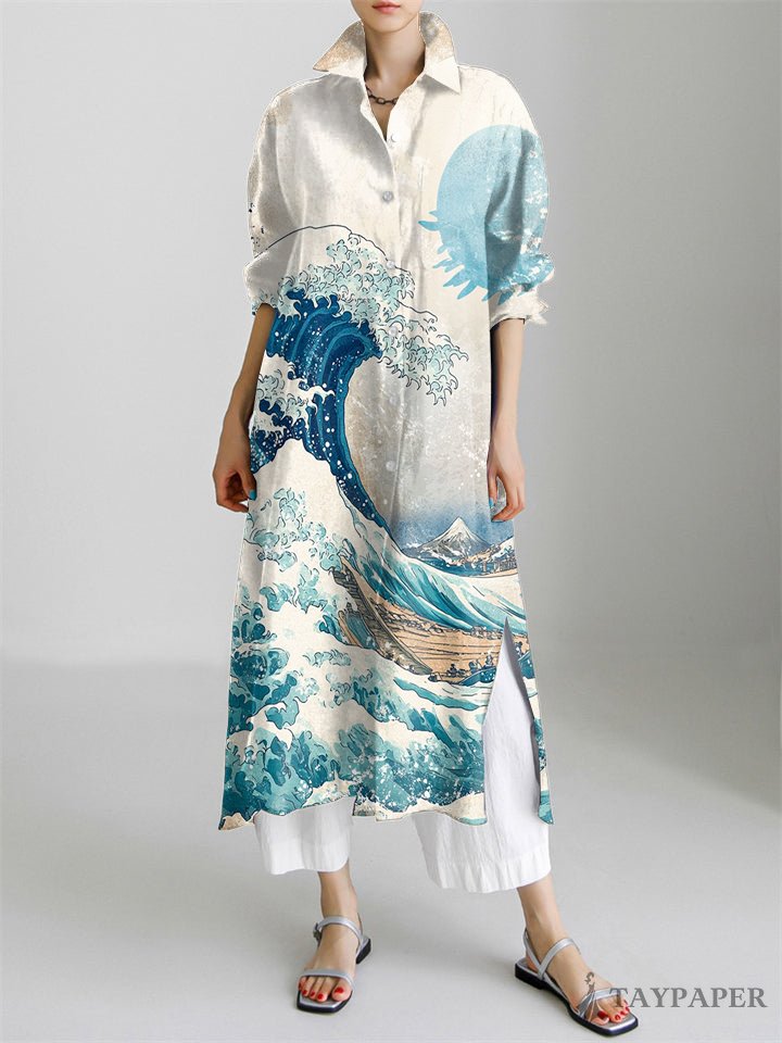 Great Wave Japanese Art Print Long Sleeve Slit Shirt Dress