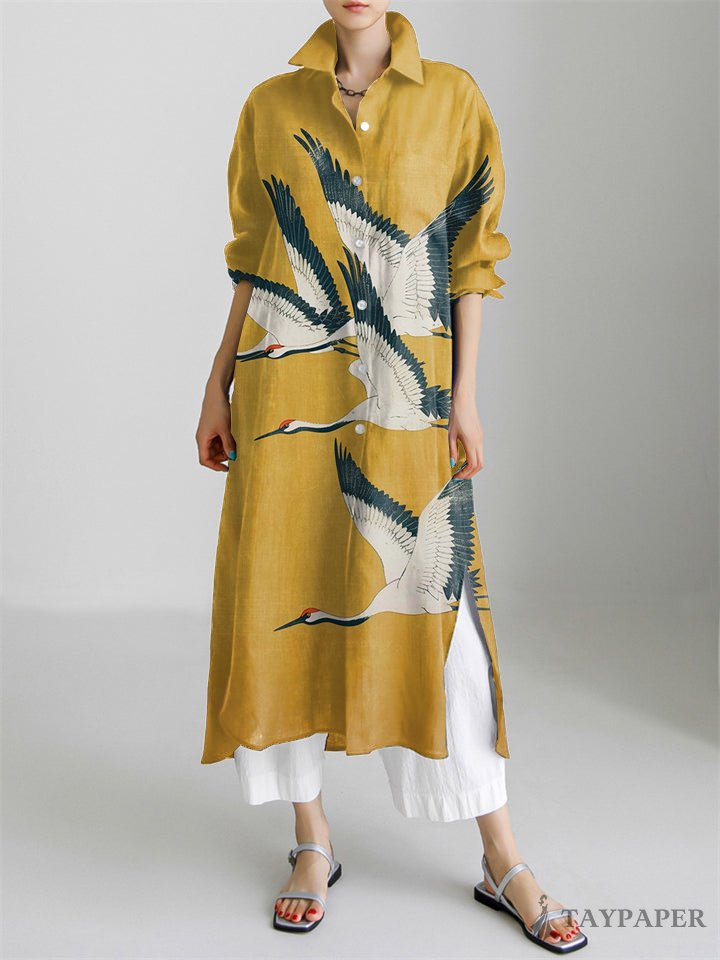 Japanese Art Crane Print Long Sleeve Slit Shirt Dress