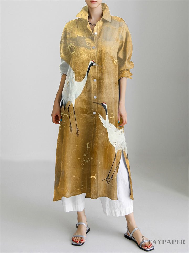 Japanese Art Crane Print Long Sleeve Slit Shirt Dress