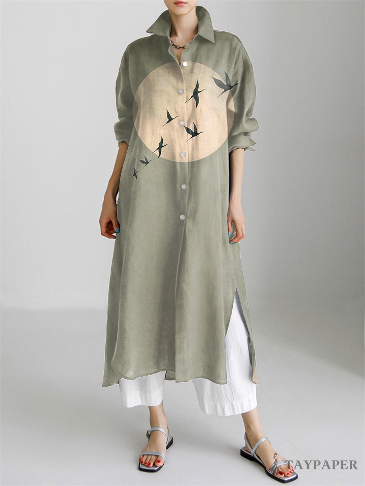 Japanese Art Crane Print Long Sleeve Slit Shirt Dress