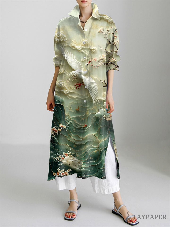 Japanese Art Crane Print Long Sleeve Slit Shirt Dress
