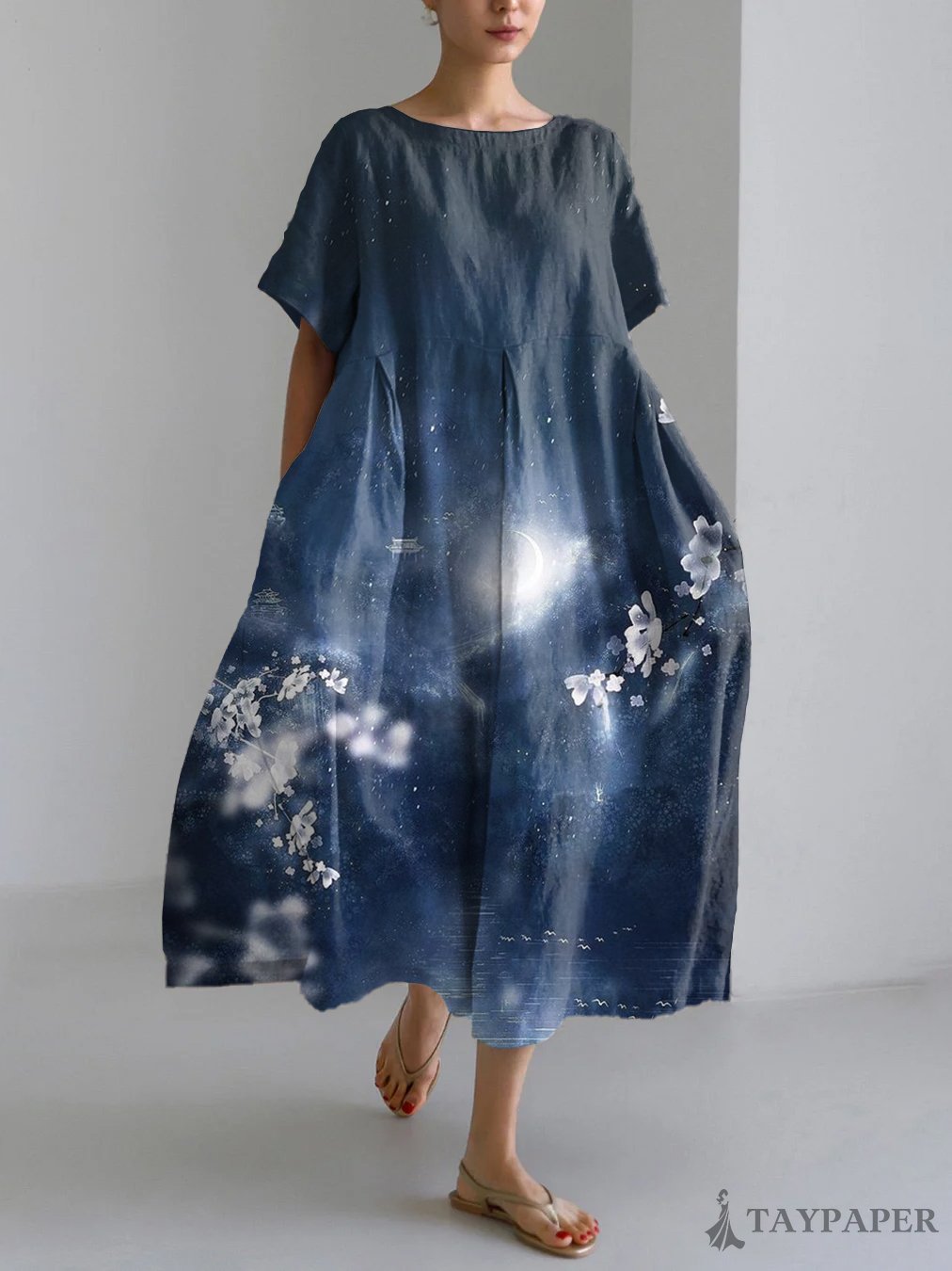 Japanese Art Floral Print Linen Blend Maxi Dress