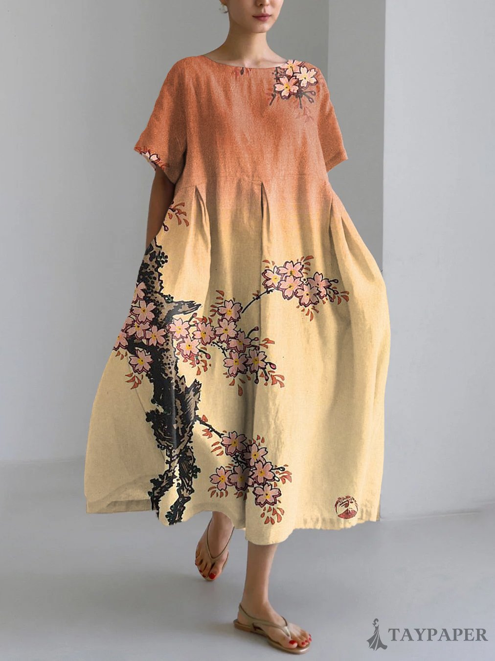 Japanese Art Floral Print Linen Blend Maxi Dress