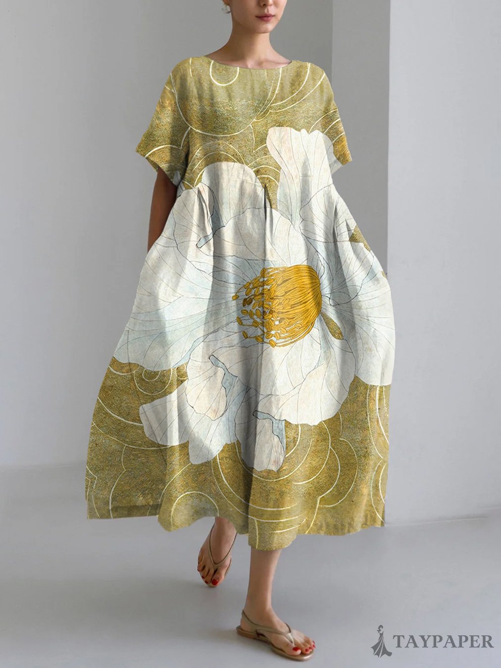 Japanese Art Flowers Print Linen Blend Maxi Dress