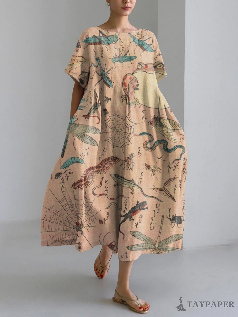 Japanese Art Frogs Insects Crutters Print Linen Blend Maxi Dress