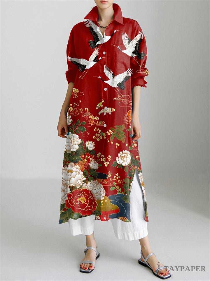 Japanese Art Vintage Crane And Flower Art Print Long Sleeve Slit Shirt Dress