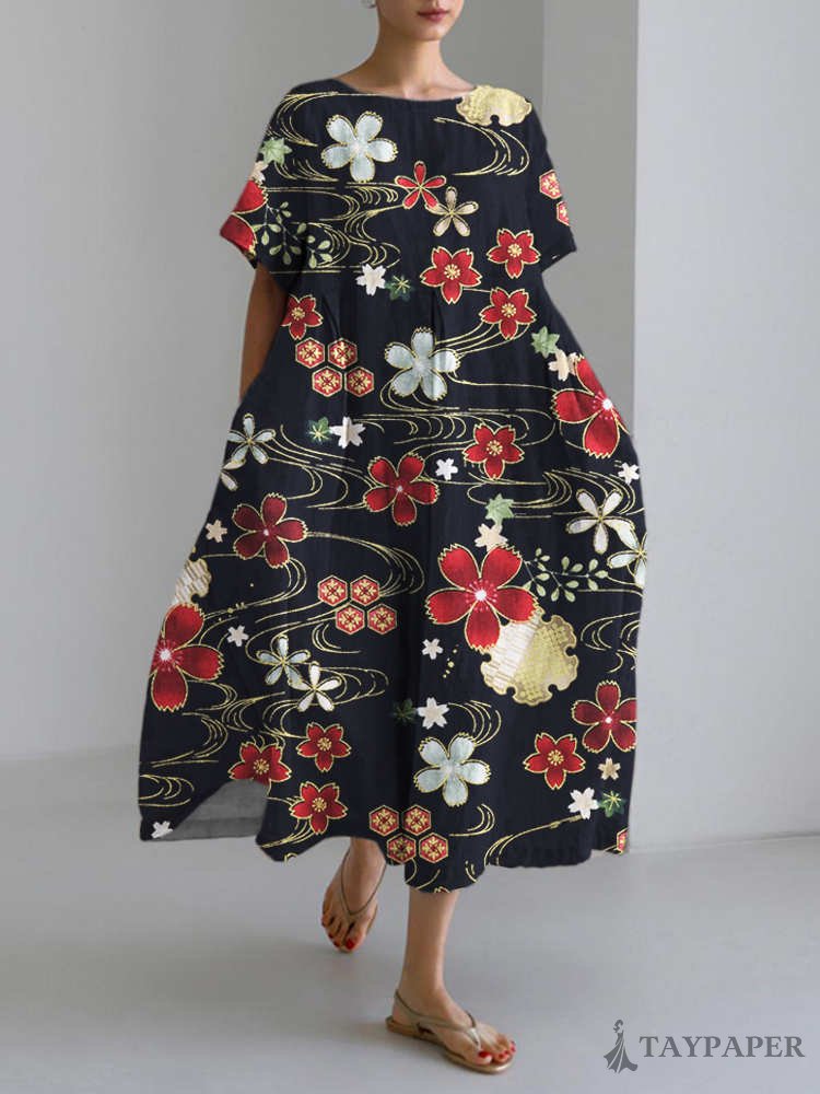 Japanese Cherry Blossom Linen Short Sleeve Maxi Dress