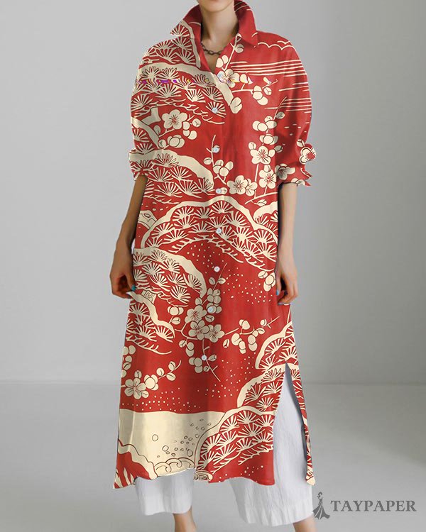 Japanese Classic Plum Blossom Long Sleeve Slit Shirt Dress