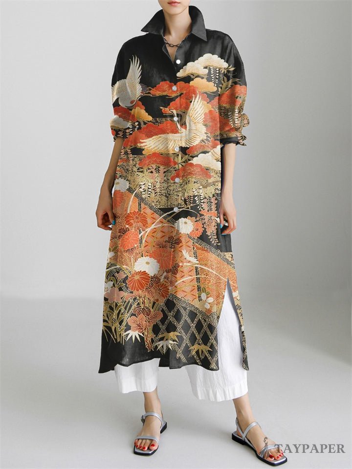 Japanese Cranes & Flowers Print Long Sleeve Slit Shirt Dress