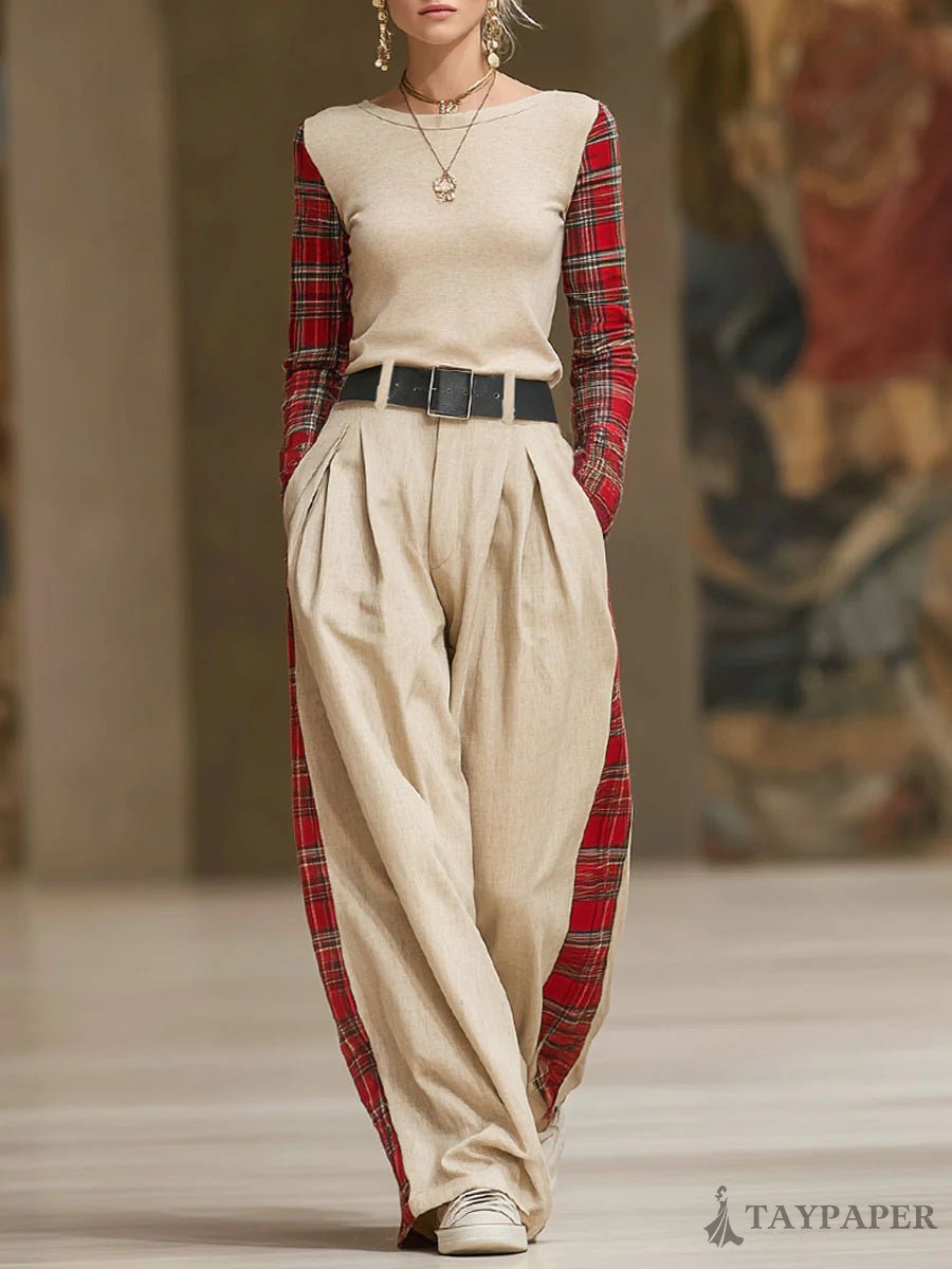 Red plaid patchwork long-sleeved T-shirt and loose wide-leg pants set(Includes belt)