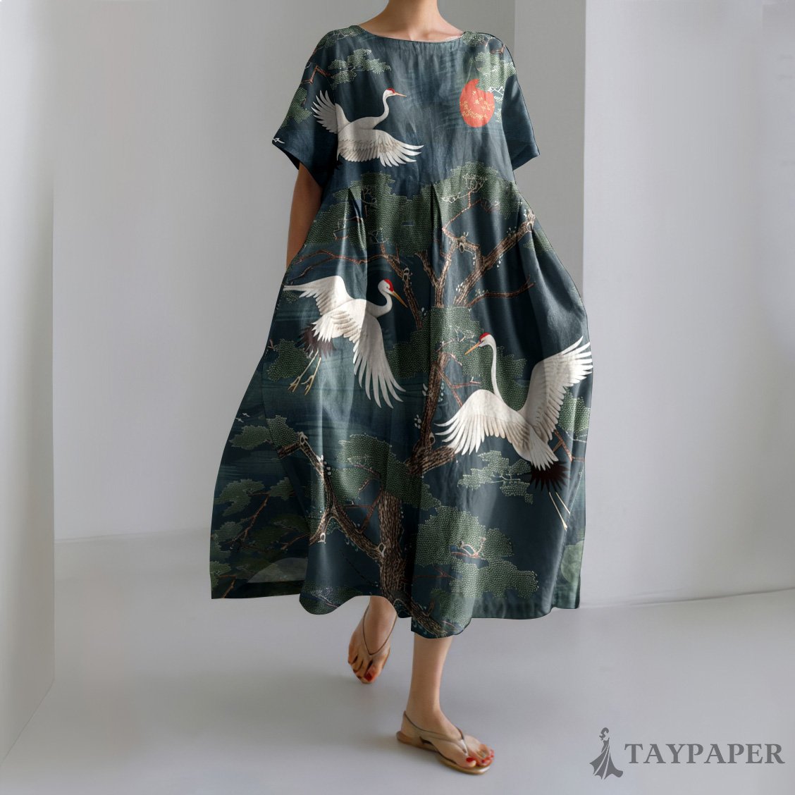 Retro Japanese Art Crane and Forest Print Linen Blend Dress