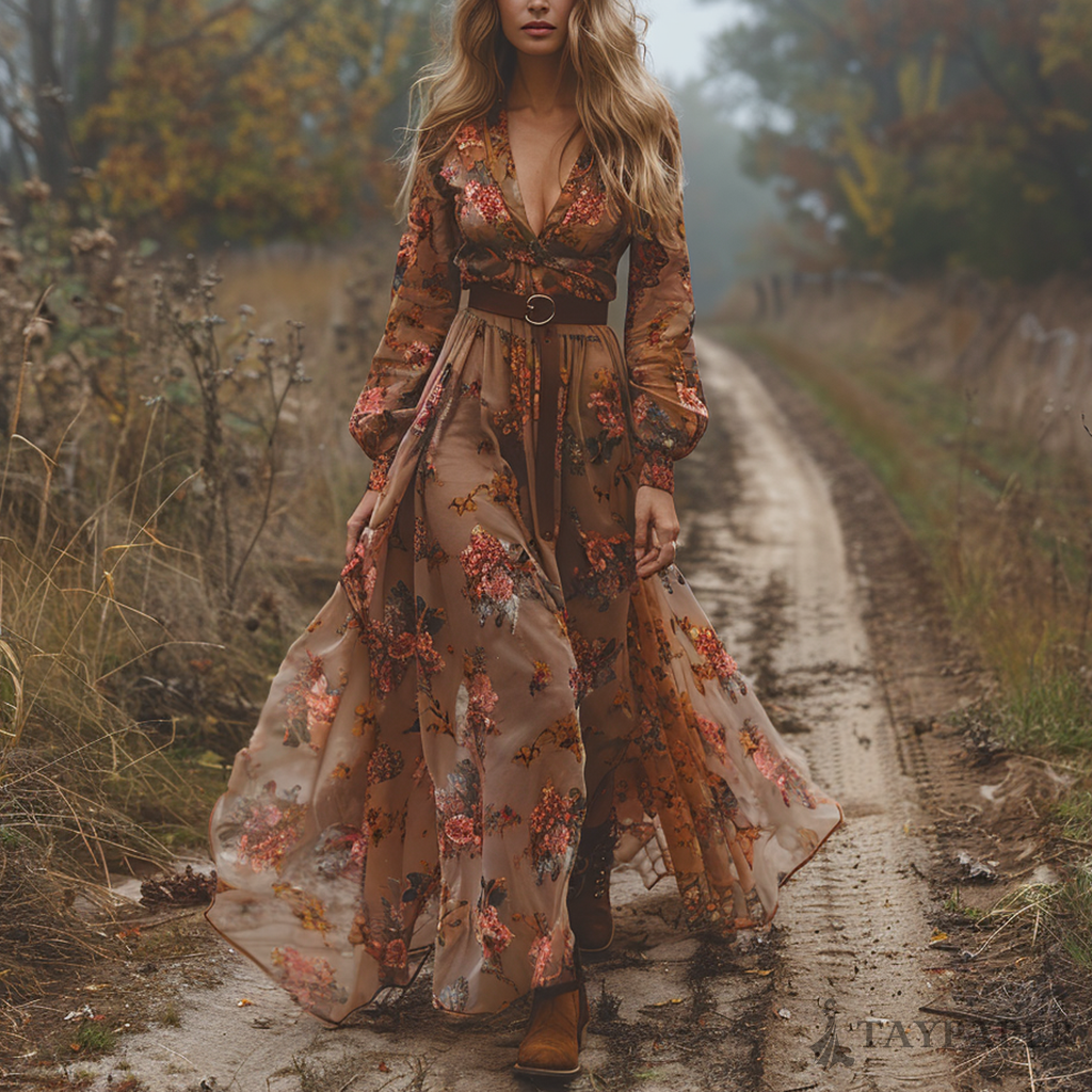 Women's Vintage Country Pastoral Linen Style Long-sleeve Maxi Long Dress