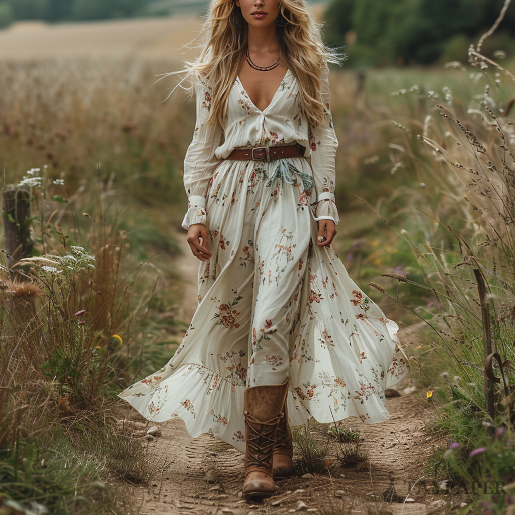 Women's Retro V-neck Floral Long-sleeve Bohemian Pastoral Style Maxi Long Dress