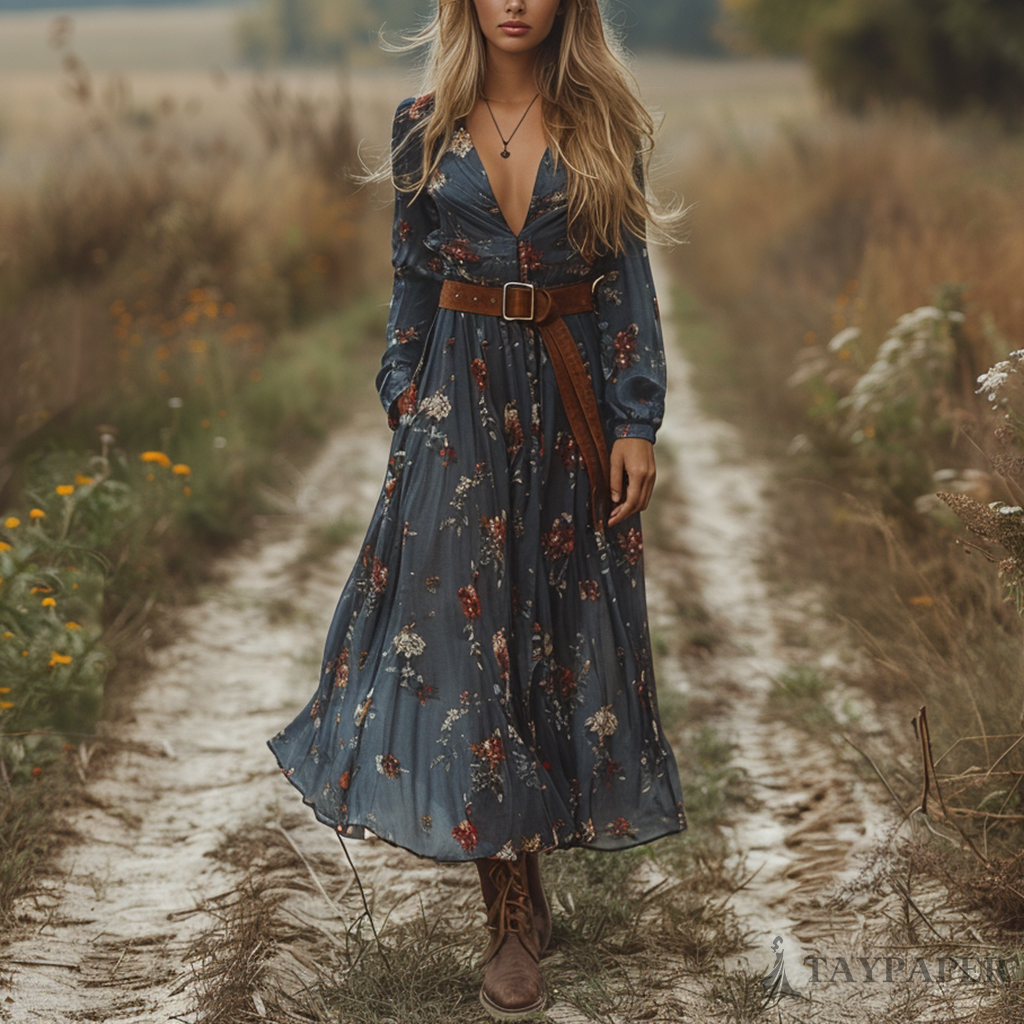 Women's Retro V-neck Floral Long-sleeve Bohemian Pastoral Style Maxi Long Dress