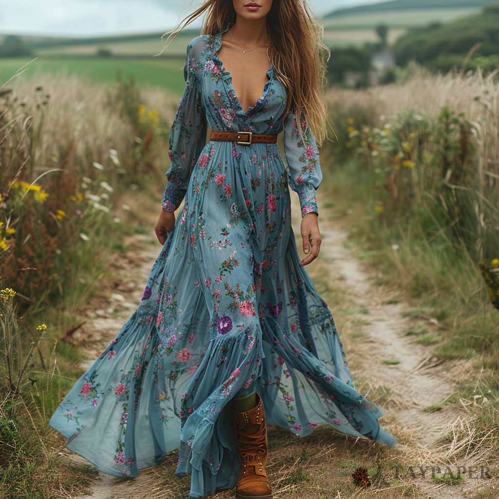 Women's Vintage Country Pastoral Linen Style Long-sleeve Maxi Long Dress