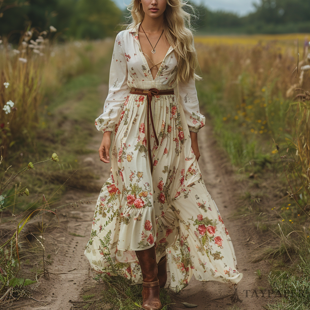 Women's Retro V-neck Floral Long-sleeve Bohemian Pastoral Style Maxi Long Dress