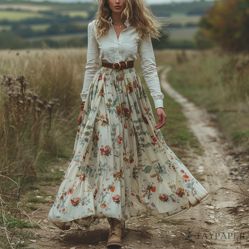 Women's Retro V-neck Floral Long-sleeve Bohemian Pastoral Style Maxi Long Dress