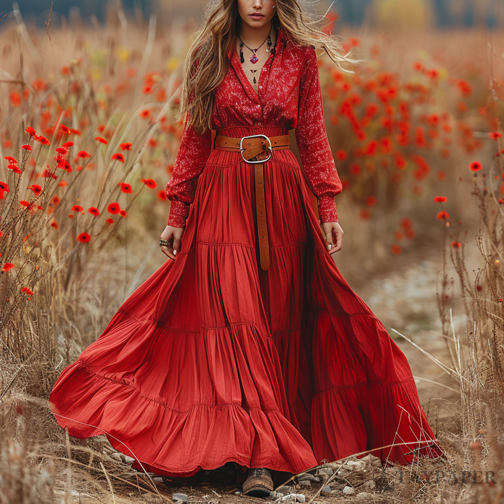 Women's Retro V-neck Floral Long-sleeve Bohemian Pastoral Style Maxi Long Dress