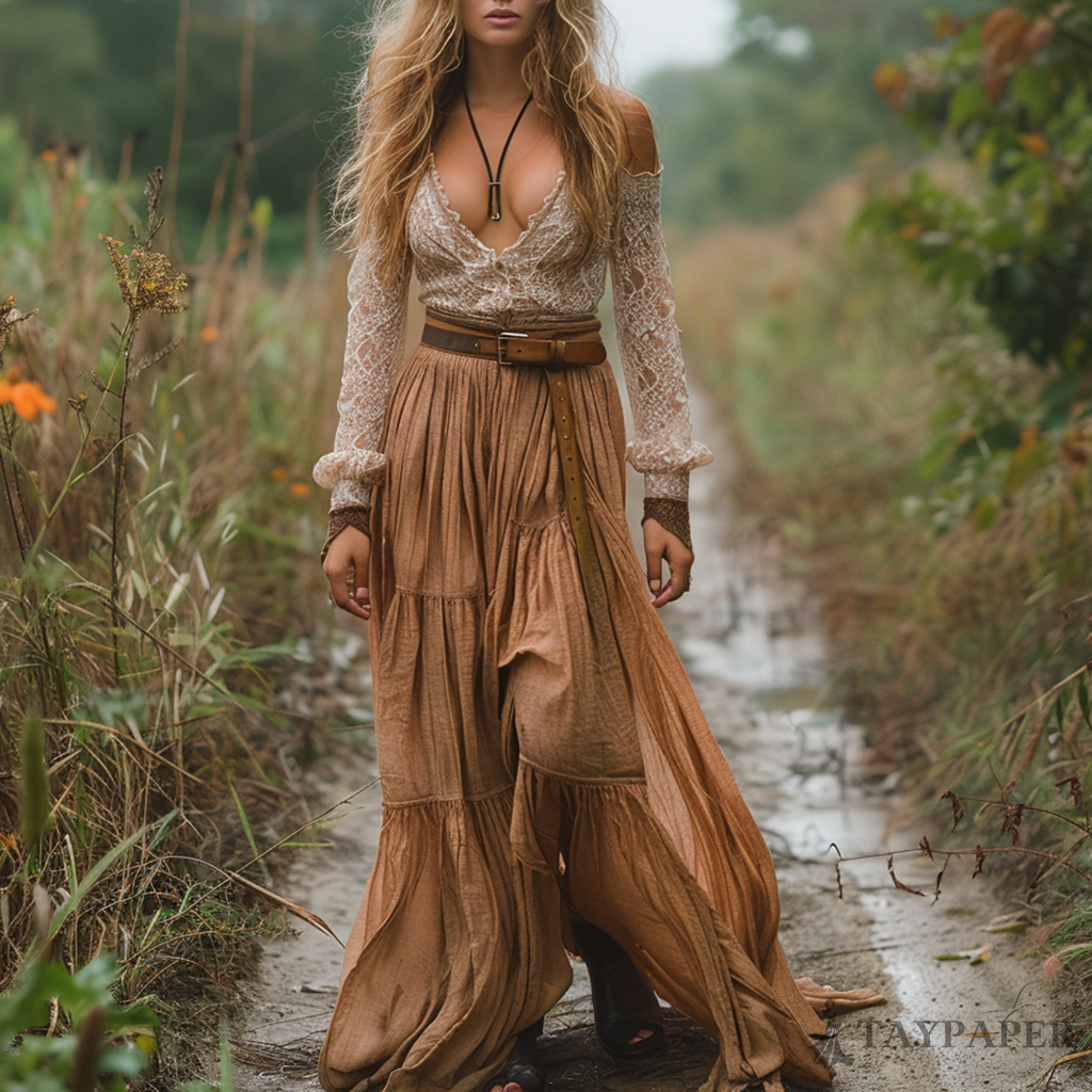 Women's Retro V-neck Country Pastoral Linen Style Long-sleeve Casual Maxi Long Dress