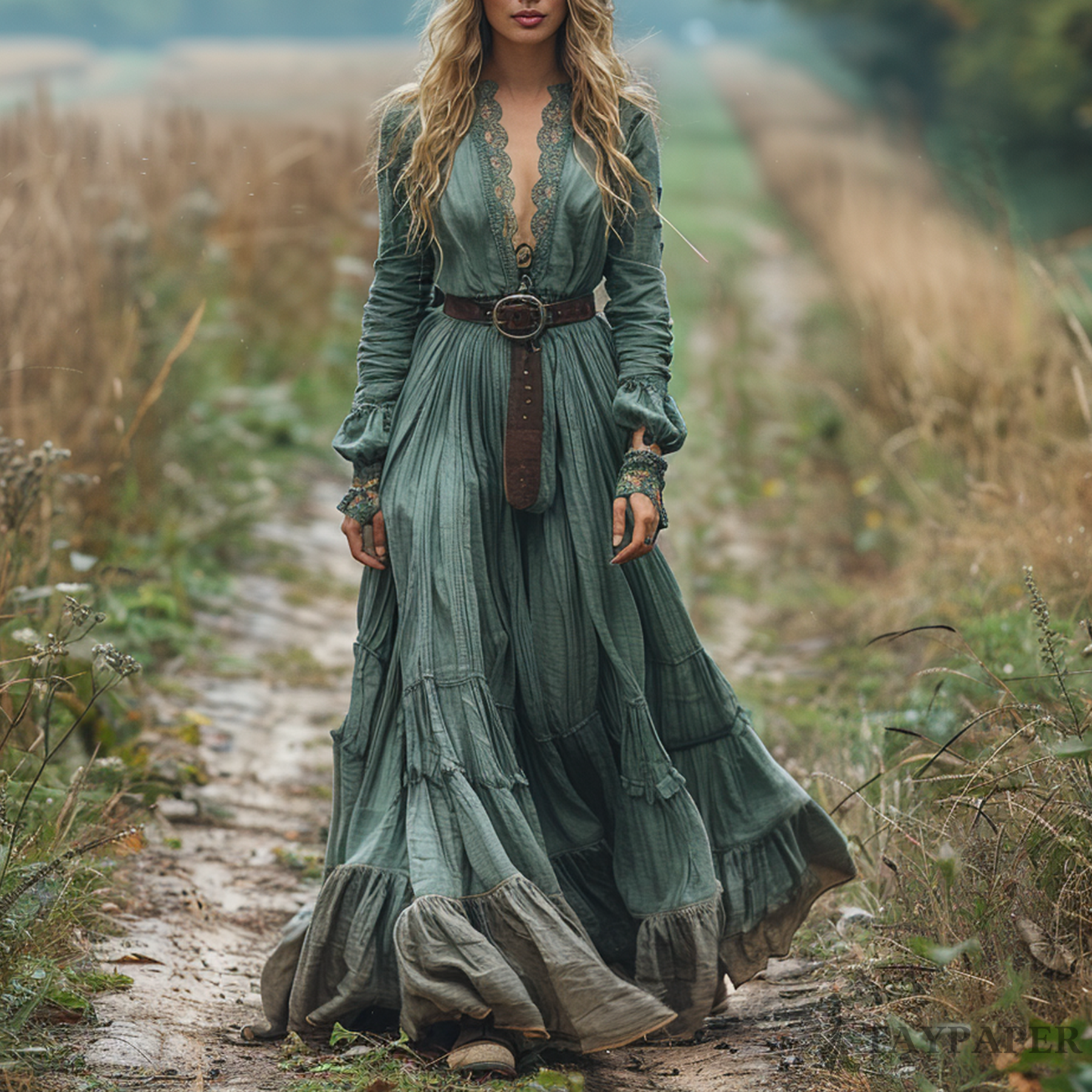 Women's Retro V-neck Country Pastoral Linen Style Long-sleeve Casual Maxi Long Dress
