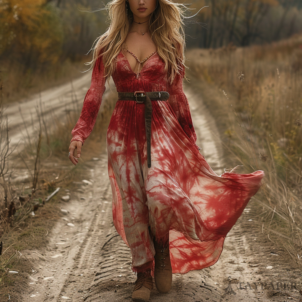 Women's Retro V-neck Linen Pastoral Halloween Style Long-sleeve Maxi Long Dress