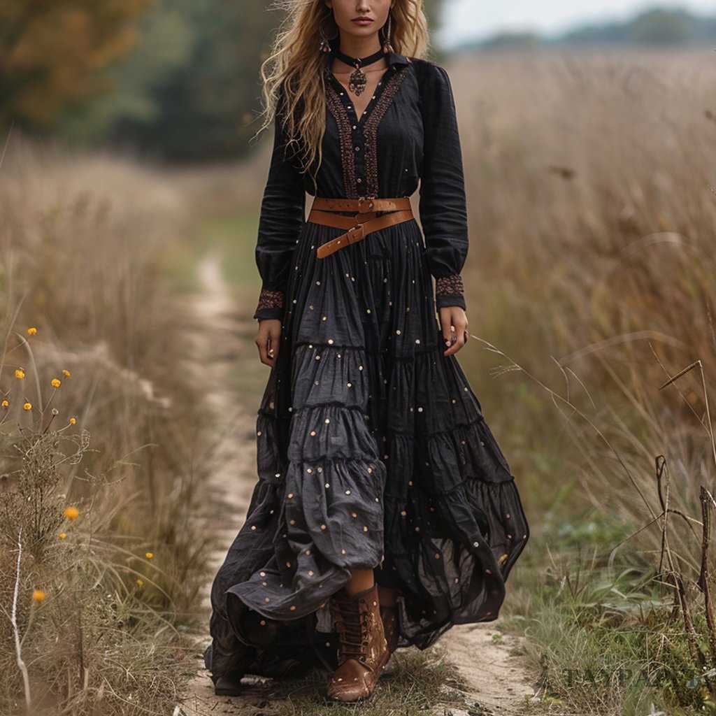 Women's Vintage V-neck Bohemian Pastoral Style Long-sleeve Maxi Long Dress