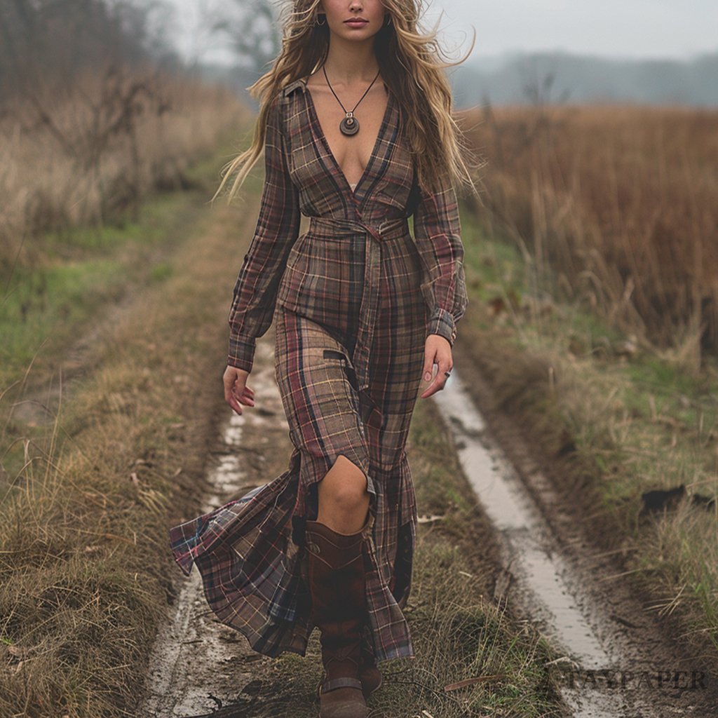 Women's Vintage V-neck Bohemian Pastoral Style Long-sleeve Maxi Long Dress