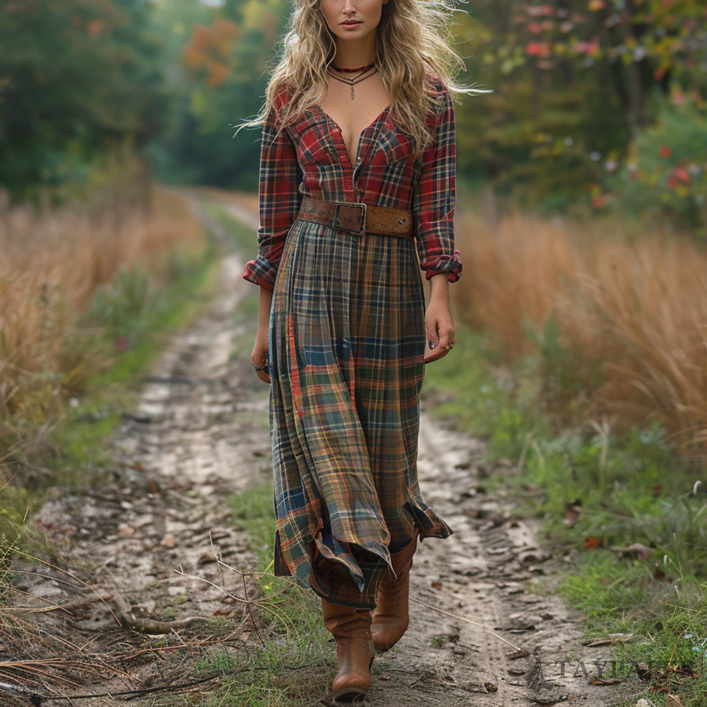 Women's Retro V-neck Plaid Long-sleeve Bohemian Pastoral Style Maxi Long Dress