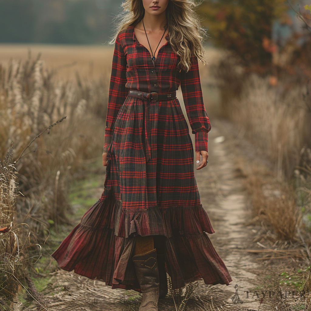 Women's Vintage V-neck Bohemian Pastoral Plaid Style Long-sleeve Maxi Long Dress