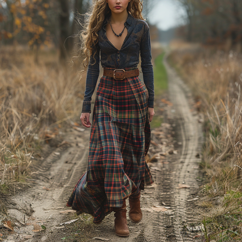 Women's Retro V-neck Plaid Long-sleeve Bohemian Pastoral Style Maxi Long Dress