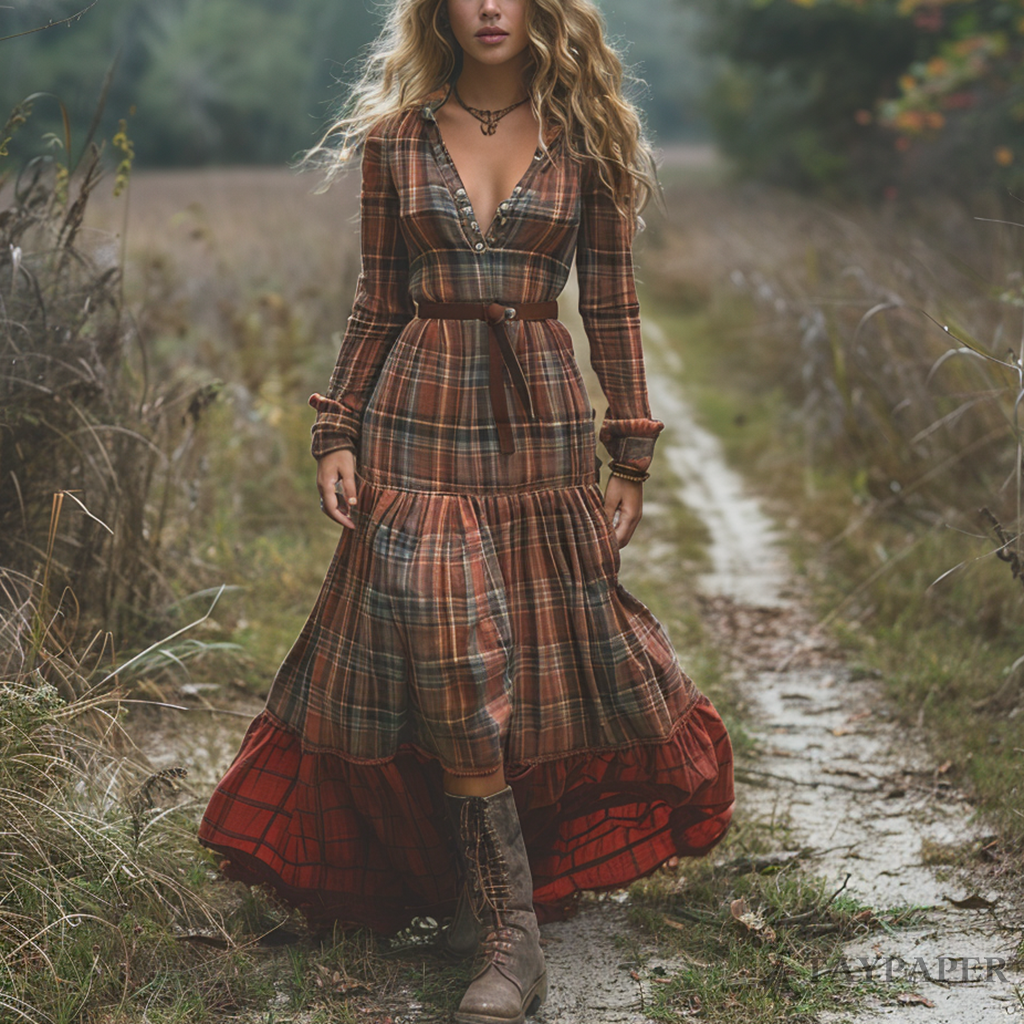 Women's Vintage V-neck Bohemian Pastoral Plaid Style Long-sleeve Maxi Long Dress
