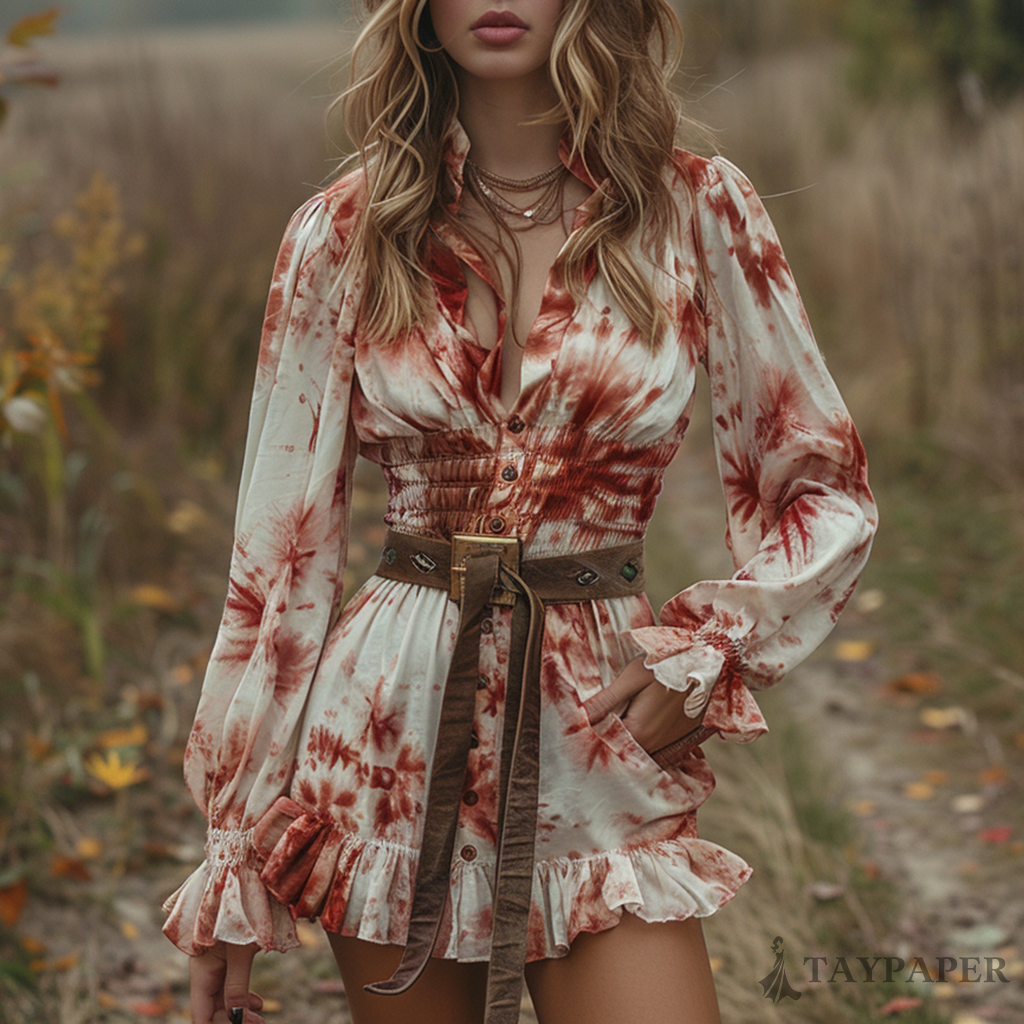 Women's Retro V-neck Tie Dye Pastoral Style Halloween Party Mini Short Dress
