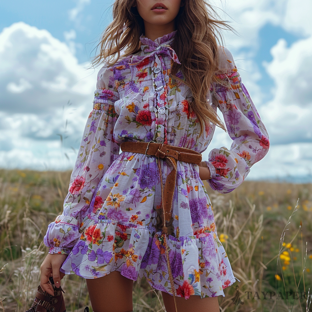 Women's Retro Floral Bohemian Pastoral Style Long-sleeved Mini Short Dress