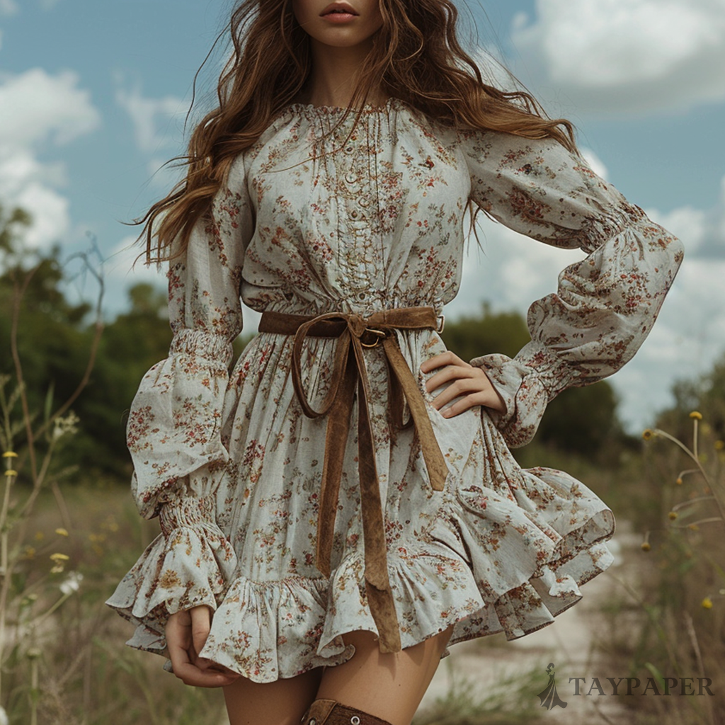 Women's Retro Floral Bohemian Pastoral Style Long-sleeved Mini Short Dress