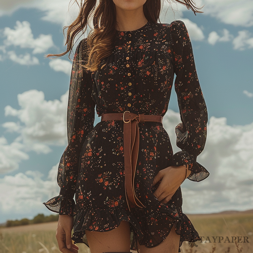 Women's Retro Floral Bohemian Pastoral Style Long-sleeved Mini Short Dress