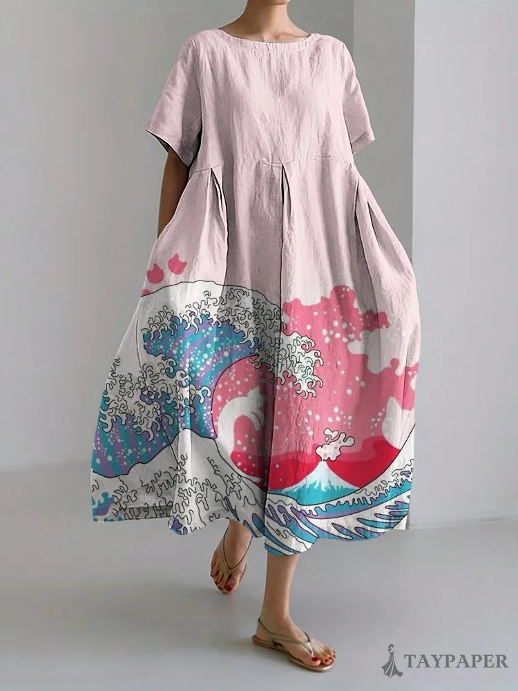 Trans Color Cat & Great Wave Japanese Art Print Linen Blend Maxi Dress