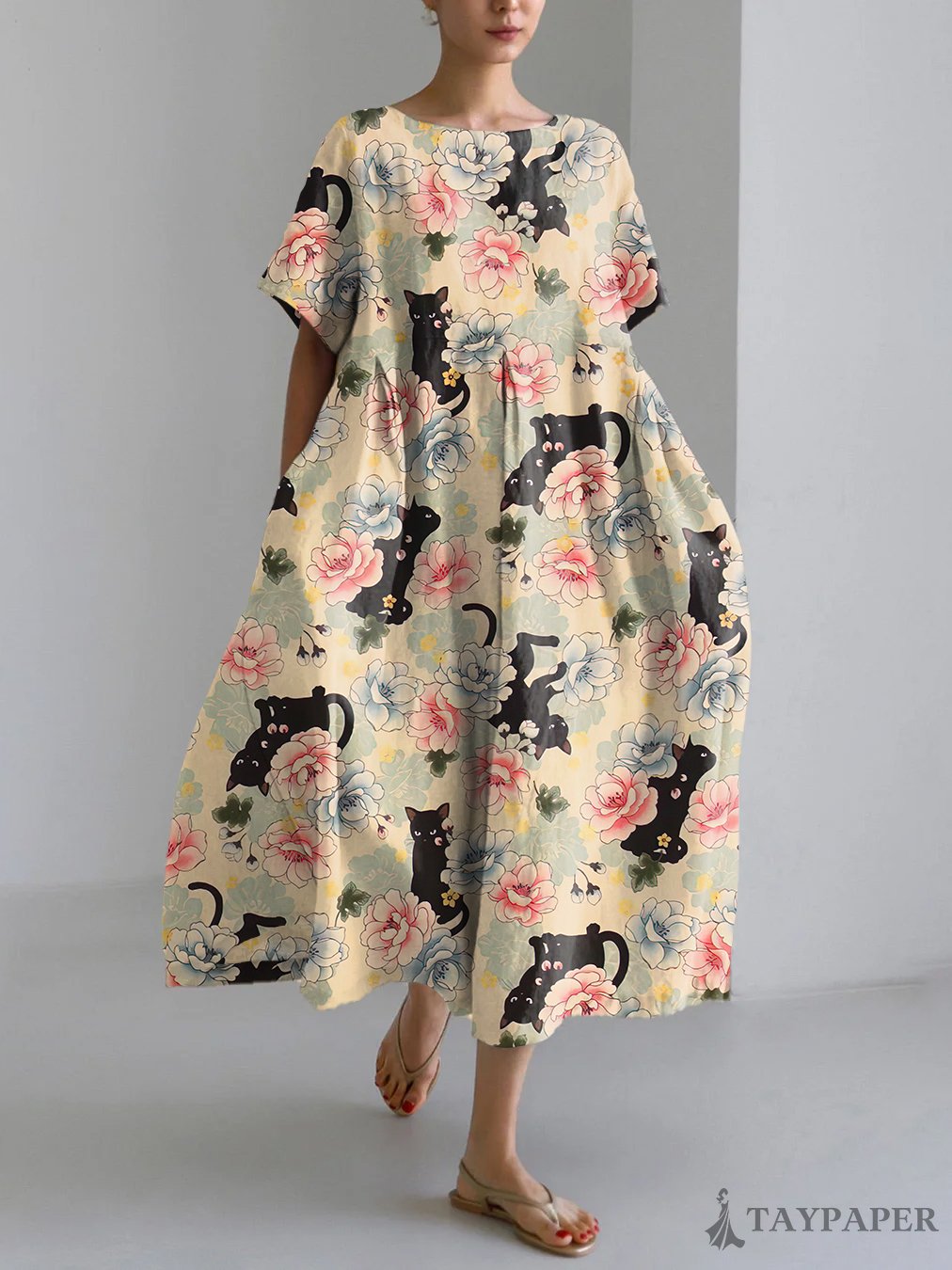 Vintage Black Cat Floral Pattern Linen Blend Maxi Dress