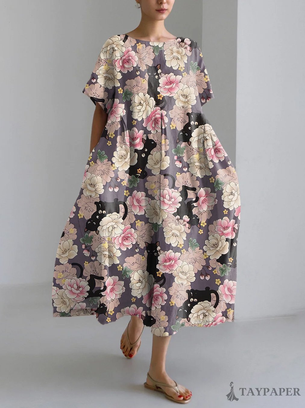 Vintage Black Cat Floral Pattern Linen Blend Maxi Dress