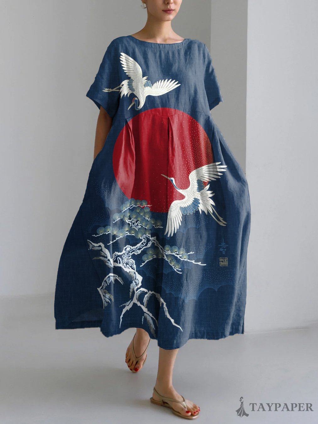 Vintage Crane Japanese Art Print Linen Blend Maxi Dress