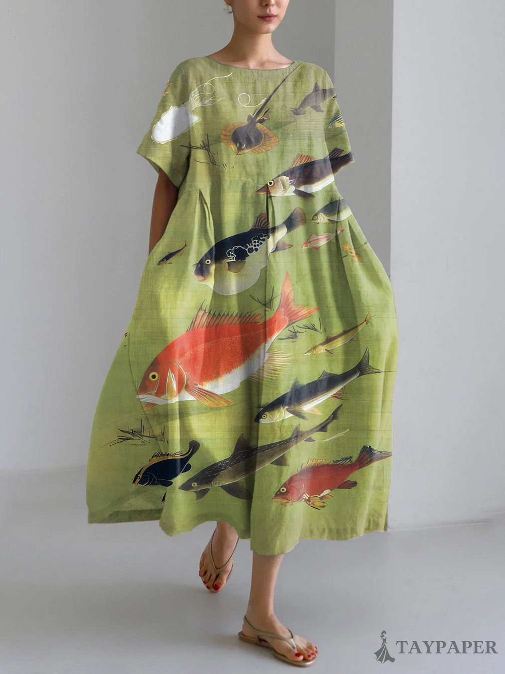 Vintage Fish Art Print Linen Blend Maxi Dress